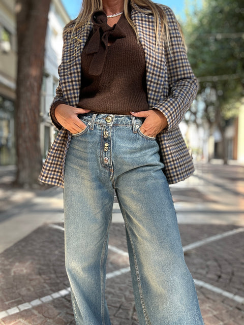 Jeans modello Adriana, invecchiato con zip e particolari bottoni capobroche a renderlo unico