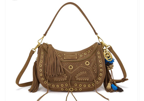 Borsa hobo in pelle scamosciata con lavorazioni a intreccio e borchie applicate, chiusura a zip e manico e tracolla rimovibili