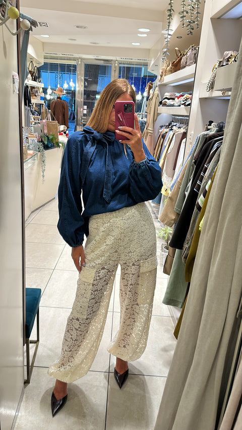 Pantalone in pizzo macramè , con tasche laterali , elastico o in vita e infondo alla caviglia . Con foderi a culotte.