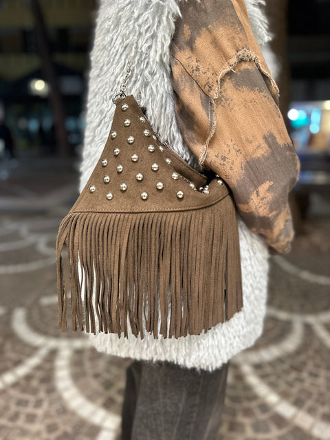 Pochette in crosta con frange e borchie ornamentali, chiusura a zip